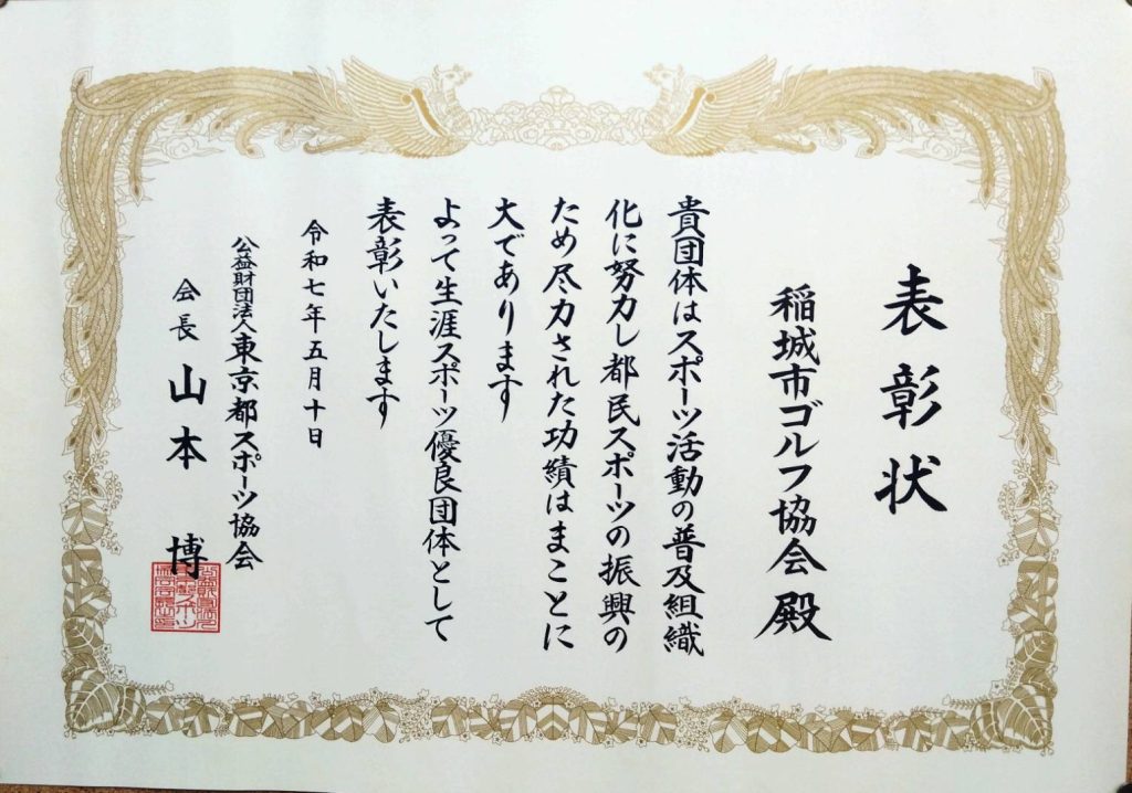 また、令和7年度(公財)東京都スポーツ協会より生涯スポーツ優良団体として表彰され、5月10日の第78回東京都スポーツ大会・第26回東京都障害者スポーツ大会合同開会式で飯野会長に表彰状と盾が贈られました。